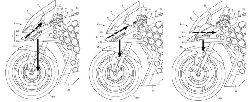 Si tratta di una soluzione ingegnosa che potrebbe ridefinire gli standard di sicurezza nel settore delle motociclette. Presentato in un recente brevetto, il sistema utilizza ali mobili posizionate nella parte anteriore della moto, simili a quelli aerodinamici delle supersportive. Tuttavia, a differenza delle ali tradizionali, queste si attivano solo quando è necessario. Di fatto i sensori rilevano un’eccessiva inclinazione della moto e attivano un meccanismo che estende gli alettoni, generando una forza verso il basso per contrastare il sollevamento della ruota anteriore.