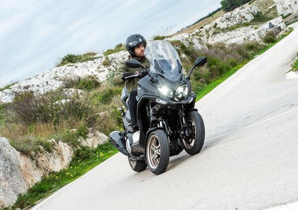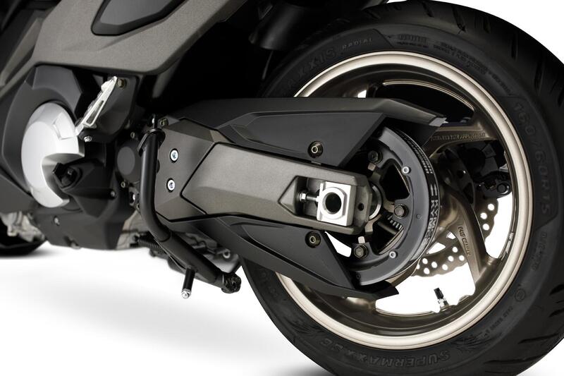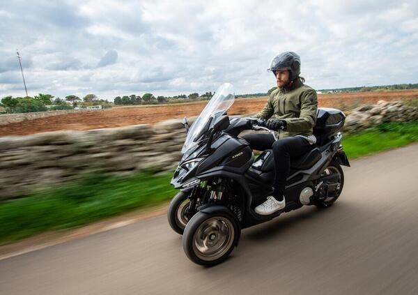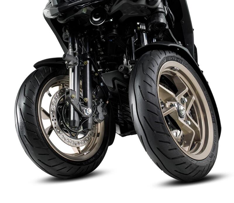 Le ruote misurano 13 pollici davanti e 15 dietro, l'avantreno è articolato secondo uno schema a quadrilatero e ogni ruota è servita da una coppia di steli forcella soltanto in apparenza simile a quanto visto sui tre ruote Yamaha.