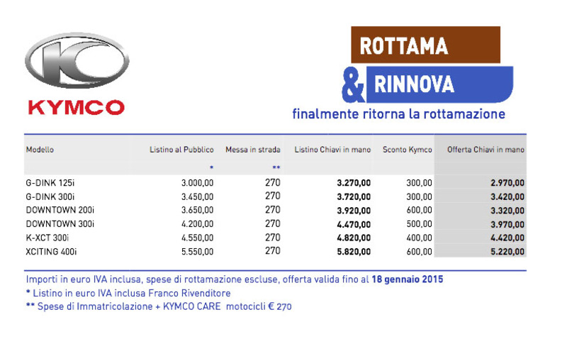 All'acquirente è offerta la soddisfazione di poter valorizzare il proprio usato e i veicoli accettati per la rottamazione sono tutti i motocicli e i ciclomotori fino all’Euro 2. Il contributo viene devoluto da KYMCO in collaborazione con i Rivenditori che aderiscono all’iniziativa. L’ offerta é valida fino al 18 gennaio 2015, su un lotto limitato di veicoli e riguarda G-Dink 125i-300i, Downtown 200i-300i, K-XCT 300i e Xciting 400i. La promozione è differenziata a seconda del modello.