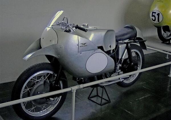 Nel 1952 la Guzzi ha realizzato, su progetto dell’ing. Gianini, una 500 da Gran Premio a quattro cilindri in linea longitudinale, con trasmissione finale ad albero. Il motore aveva la distribuzione bialbero e veniva alimentato da un sistema di iniezione indiretta piuttosto macchinoso che è stato ben presto sostituito da quattro carburatori.