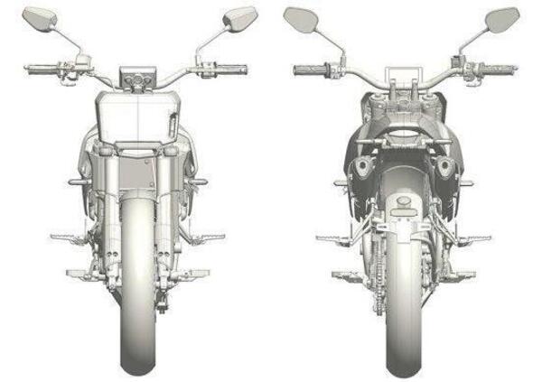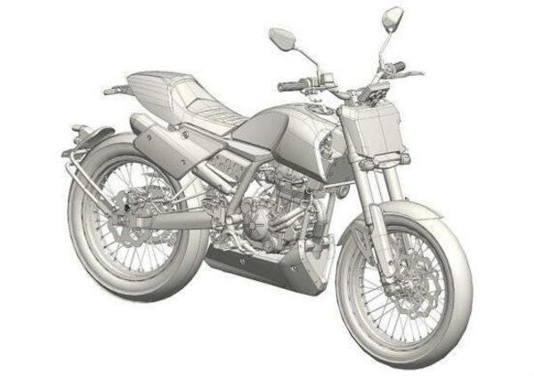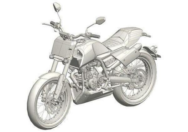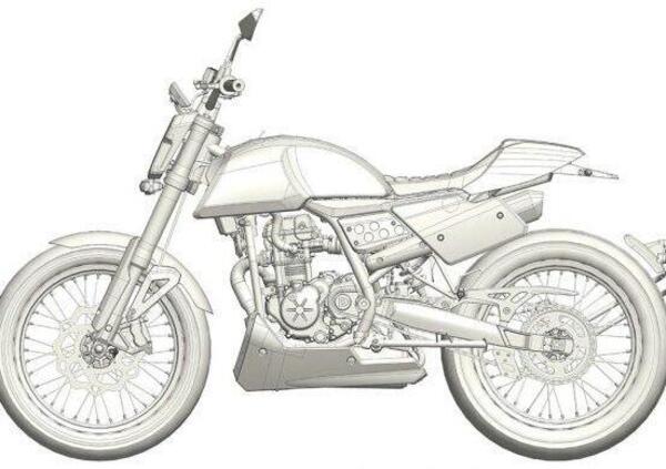 Questo per inquadrare l'origine del brevetto che riguarda appunto un modello stradale con motore 150 cc, bialbero raffreddato a liquido, e con ruote a raggi nelle misure di 19 pollici che si combinano con l'impostazione estetica da flat track.