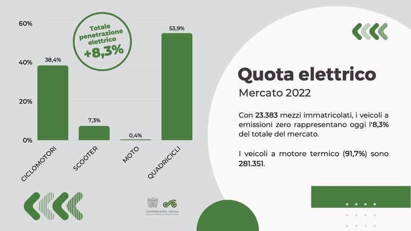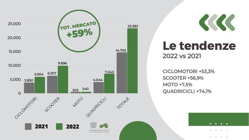 Il comparto cresce del 59% nel 2022, una crescita ancor più rilevante se analizziamo i dati assoluti dal 2018 ad oggi. In cinque anni siamo passati da 4.200 a 23.300 immatricolazioni annuali. In assoluto non sono numeri da capogiro, ma sufficienti a rappresentare l'8,3% dell'intero mercato. Quindi è un segmento che non si può più ignorare, anzi. A tirare sono sempre gli scooter (+56,9% e 9.896 veicoli immatricolati) e i ciclomotori (+53,3% con 5.904 veicoli immatricolati) mentre le moto si mantengono costantemente trascurabili: sono appena 540 i pezzi venduti per un +7,5% che ci fa capire come in questo momento l'attenzione della clientela sia rivolta ancora altrove. Eppure può esserci interessante notare come il 57% di queste siano da asserire alla categoria naked, una classificazione un po' larga a dire il vero e che comprende anche delle moto da città di fatto, mentre le rimanenti siano prodotti più specialistici tra enduro, trial, supermotard. Vien da pensare che la futura crescita possa avvenire proprio lì.