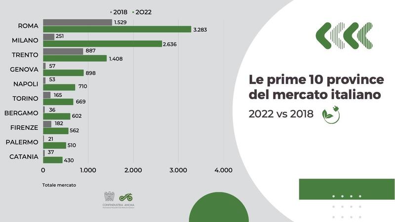 L'elettrico si diffonde un po' in tutta Italia ma mentre le posizioni di testa delle grandi città appaiono fin troppo scontate è più curioso notare come quest'anno si siano registrate crescite importanti anche in province meno popolose e al Sud. Balza subito all'occhio il terzo posto di Trento, ma c'è un inganno prospettico: qui hanno sede alcune compagnie di noleggio che poi distribuiscono i propri veicoli lungo lo Stivale ed è dunque difficile sapere dove effettivamente circola l'immatricolato. In secondo luogo colpiscono i balzi in avanti delle tre città del sud: Napoli, Palermo e Catania hanno registrato la maggior crescita percentuale. Qui l'elettrico e il quadriciclo in particolare ha offerto risposta alle esigenze dettate dal traffico di una mobilità meno invadente di quella automobilistica. Appare dunque meno casuale, quindi, che benché in presenza di incentivi l'industria dell'auto continui a registrare dati negativi mentre quella della mobilità leggera sia in positivo.