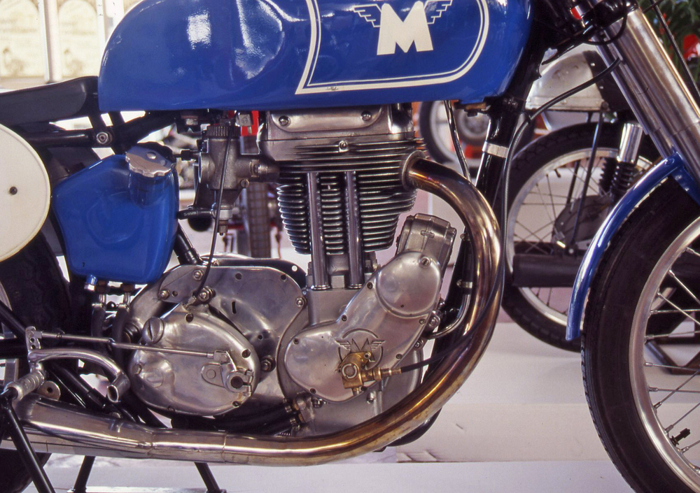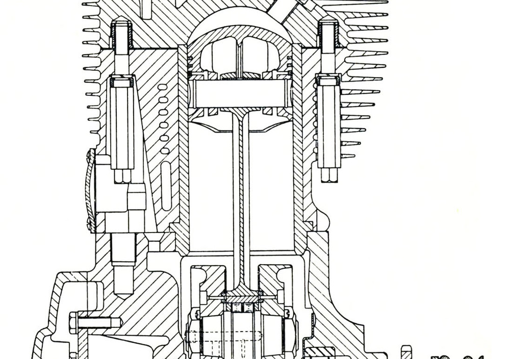 Il motore aveva una struttura molto semplice, come si conviene a un monocilindrico, era ben curato in tutti i dettagli ed era realizzato con eccellenti materiali. Si trattava di un mezzo destinato non solo agli sportivi più esigenti, ma anche ai piloti privati che impiegavano queste moto nel clubman racing o comunque nelle gare nazionali di velocità di livello appena inferiore ai GP. La distribuzione prevedeva due alberi a camme, dotati di un eccentrico ciascuno, posti sul lato destro e azionati mediante ingranaggi. Il moto veniva trasmesso alle valvole, i cui assi formavano un angolo di 66°45’, da punterie a piattello, aste e bilancieri a due bracci in acciaio forgiato. Per il richiamo delle valvole si impiegavano molle a elica. Ciascun perno di banco veniva inserito nel relativo volano con interferenza ed era poi assicurato ad esso mediante chiodatura. La testa della biella lavorava su due file di rullini ingabbiati, secondo una soluzione tipica della scuola inglese, per quanto riguarda i grossi mono. L’albero poggiava su due grossi cuscinetti di banco a rulli, più un terzo a sfere di minori dimensioni, posto dal lato della trasmissione primaria.