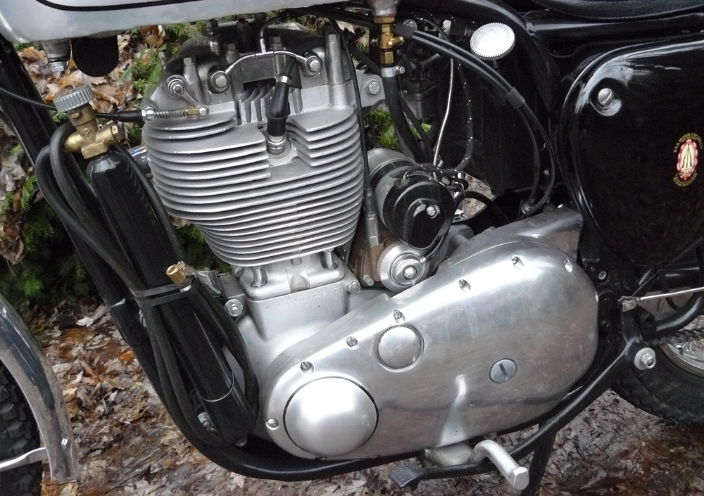 Più tranquilli a livello di modelli stradali, ma in grado di impegnare e talvolta anche di battere le Gold Star nelle gare di cross e in quelle nei deserti americani erano le 500 monocilindriche Matchless/AJS. Pure in questo caso venivano impiegati due alberi a camme che agivano su punterie a piattello. Tra le caratteristiche più interessanti di questi robusti motori, dal disegno molto lineare, vi era l’impiego di bilancieri che non erano forgiati in un sol pezzo, come vuole la soluzione classica, ma erano realizzati in tre parti. Ciascuno di essi infatti era costituito da un perno (che si inseriva in due bussole montate nel coperchio della testa) e due bracci, ricavati da una lastra d’acciaio, che venivano vincolati alle sue estremità mediante apposite scanalature e dadi di ritegno. Un’altra particolarità si ritrovava a livello dei cuscinetti di banco: dal lato della trasmissione primaria ce ne erano due, a sfere, mentre dal lato del comando distribuzione veniva impiegata una bussola in bronzo. Le sedi delle valvole non erano montate con interferenza ma venivano incorporate nella testa all’atto della fusione.