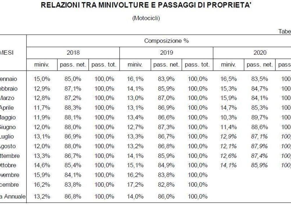 Il rapporto fra usato e nuovo, nei primi dieci mesi del 2020, è perciò di 234 motocicli usati ogni 100 nuovi. Di 297 nel solo mese di ottobre.