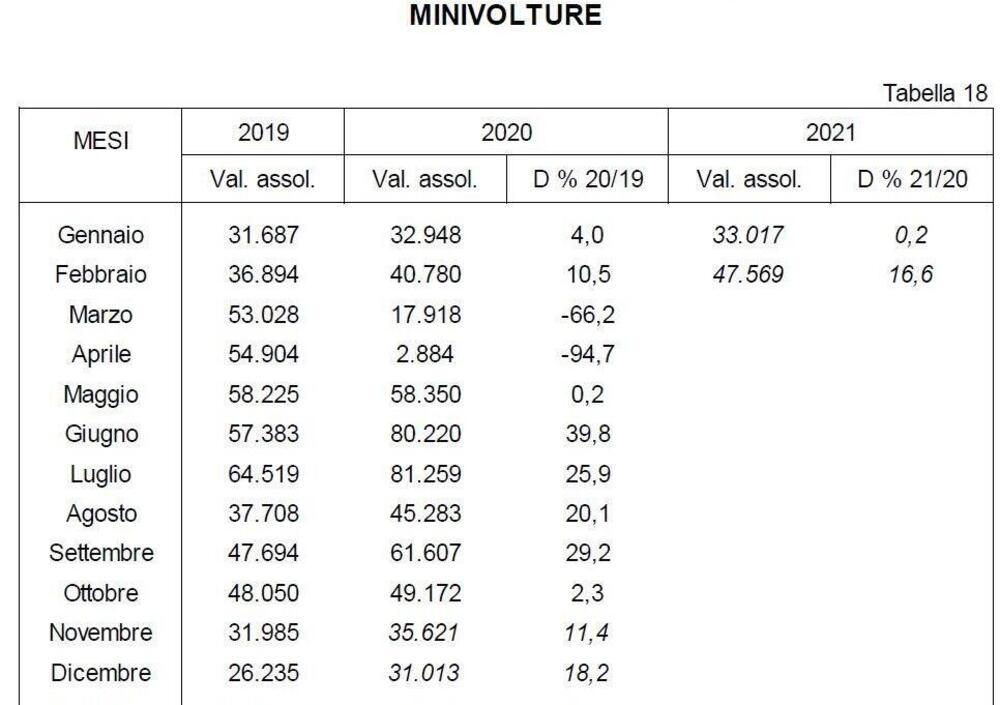 Per completezza di informazione ricordiamo che il mercato del nuovo per quanto riguarda la vendite di automobili è stato in calo del 12,3% (ovvero 143.000 unità), i passaggi di proprietà netti sono stati 262.000 (+0,1%) e le radiazioni 140.570 (+6,2%).