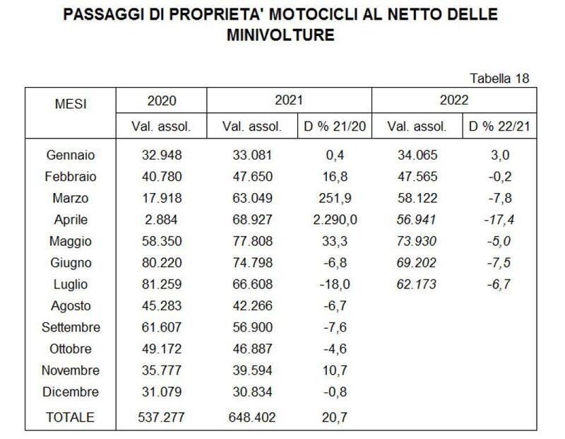 Nei primi sette mesi di quest'anno i trasferimenti di proprietà netti sono stati 401.894, l'usato moto e scooter (le due categorie sono accorpate in queste statistiche) ha quindi visto una flessione del 6,9%, mentre in rapporto il mercato del nuovo ha perso meno (ovvero -4%), grazie a 205.732 immatricolazioni. Soprattutto il nuovo ha avuto un andamento con minori sbalzi fra un mese e l'altro.