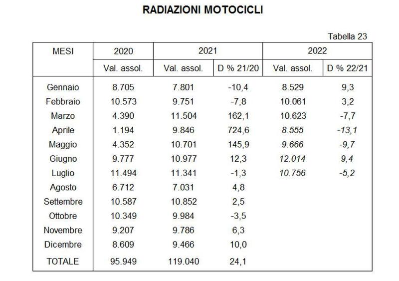 Da gennaio a luglio le radiazioni moto e scooter sono state 67.222, ovvero -6,5% rispetto alle 71.921 dell'anno precedente.