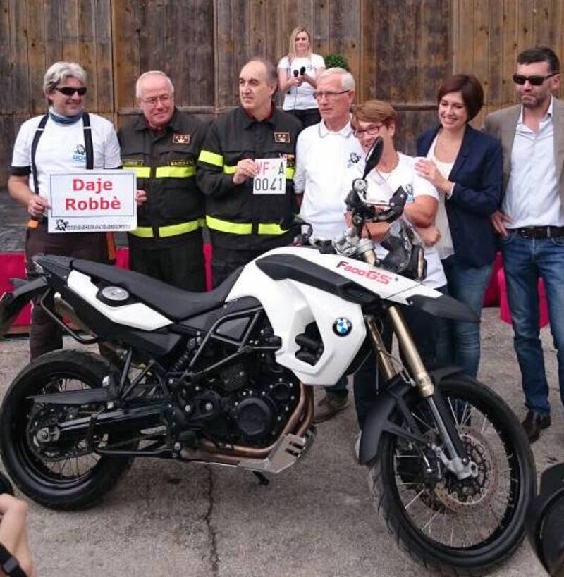 La moto entra ufficialmente a far parte dei mezzi di servizio del Vigili del Fuoco e questo rappresenta, per noi, il ritorno in servizio di Roberto. Lui è ancora in coma ma la sua moto è tornata per lui. A sorpresa, a Montelupone, il Direttore Regionale dei Vigili del Fuoco ci ha consegnato la nuova targa ufficiale della moto di Roberbero… momento emozionante. C’è una foto che esprime bene quel momento, in cui la sorella Rita stringe in mano la targa insieme ad un collega di Roberbero, ed io, che ho lanciato la proposta, esulto in ginocchio davanti a loro…..tanto impegno ripagato da quel momento, ce l’abbiamo fatta!