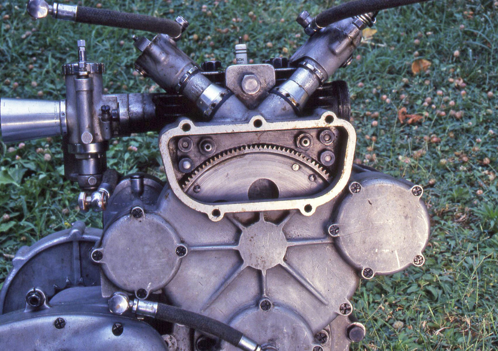 Proseguiamo il tema del comando distribuzione nelle sue varianti più atipiche dopo il primo articolo sui comandi fuori dagli schemi e il secondo dedicato alle soluzioni più fantasiose. Uno dei sistemi di comando delle valvole più inconsueti è quello adottato nel motore della OMB 350, una monocilindrica dalle prestazioni assai elevate per la sua epoca. Il progettista del motore, Enrico Pedrini, aveva studiato e regolarmente brevettato una distribuzione che prevedeva, al posto del consueto albero a camme, due “dischi a eccentrici”, analoghi a quelli impiegati nei motori stellari d’aviazione, che azionavano due bilancieri a dito; ognuno di questi ultimi muoveva una asta corta e fortemente inclinata che a sua volta trasmetteva il moto a un bilanciere a due bracci collocato nella testa. Lungo la circonferenza di ogni disco, la cui velocità di rotazione era pari a un ottavo di quella dell’albero a gomito, vi erano quattro risalti, che costituivano gli eccentrici. Questo schema, che ricordava da un lato quello a camma rialzata e dall’altro la tecnologia aeronautica, funzionava in maniera impeccabile; il motore erogava 25 cavalli a 7.000 giri/min. Le misure di alesaggio e corsa erano perfettamente “quadre” (76 x 76 mm) e le due valvole erano inclinate tra loro di 90°. La monocilindrica OMB (acronimo di Officine Meccaniche Bazzanesi) è stata presentata al salone della moto di Milano del 1947, ma in seguito non se ne è saputo più nulla. Enrico Pedrini ha proseguito altrove la sua carriera di tecnico, terminata negli anni Sessanta alla Innocenti di Milano. Suo figlio Roberto, autore dello splendido logo della mitica scuderia NCR, è stato campione italiano sidecar nel 1975 e nel 1979.