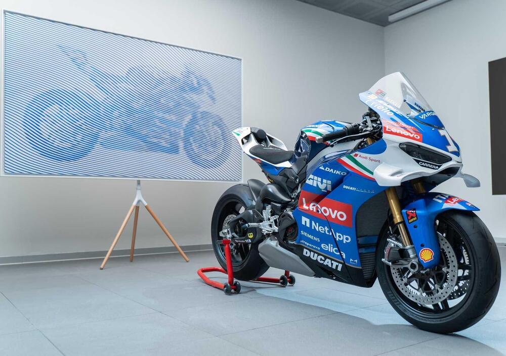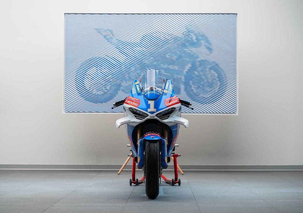 Realizzata su tela in scala 1:1, l’opera si distingue per un sofisticato intreccio di linee azzurre, colore evocativo che richiama la livrea originale della Panigale V4 Tricolore Italia. Le traiettorie, fluide e mai intersecate, danno vita a un’illusione ottica di movimento e profondità, proiettando la percezione del design della moto e della velocità in una dimensione artistica nuova e coinvolgente.