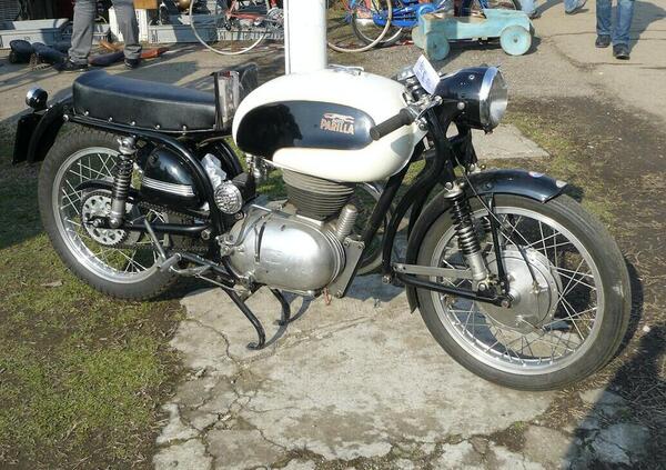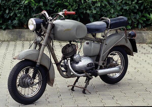 Un’altra moto italiana che gli appassionati, e gli stessi dipendenti della casa costruttrice, avevano soprannominato Bassotto è stata la Parilla 175 Sport, apparsa nel 1953 e successivamente chiamata Sport Competizione. Era dotata di una forcella Earles e aveva la ruota anteriore da 18 pollici e quella posteriore da 17, invece che da 19 come nelle altre versioni della 175 milanese. Certo l’altezza era inferiore, ma il soprannome non era azzeccato come nel caso della Alpino…