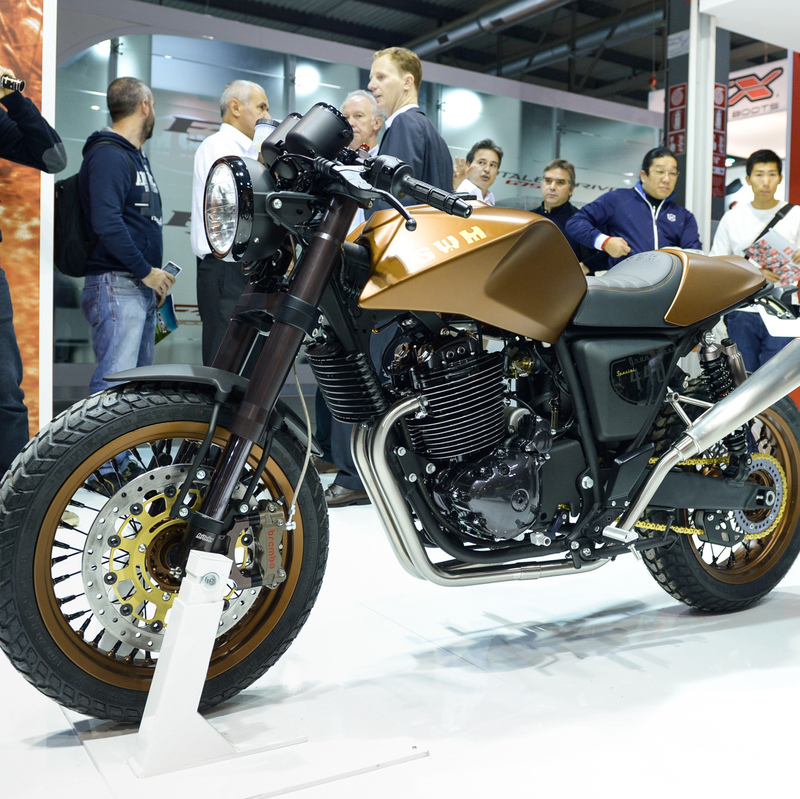 E veniamo alla Gran Milano, la prima SWM stradale vestita da café racer. La moto monta lo stesso motore della Silver Vase, rapporto finale incluso, ma si presenta appunto con un attraente look da sportiva anni 60, con tanto di silenziatore a bottiglia a mezza altezza. Anche qui troviamo il freno anteriore a disco ed il manubrio rialzato, mentre la versione Special allestita appositamente per il vernissage milanese ha il freno posteriore a disco, e i mezzi manubri.