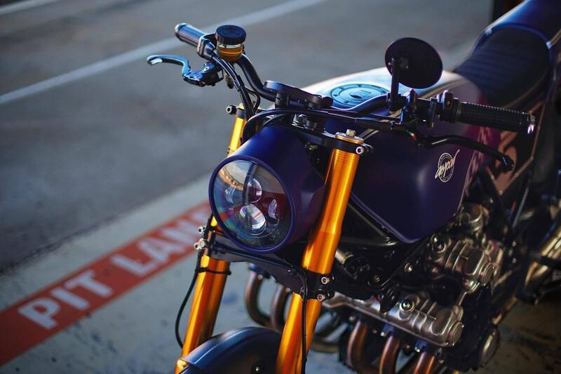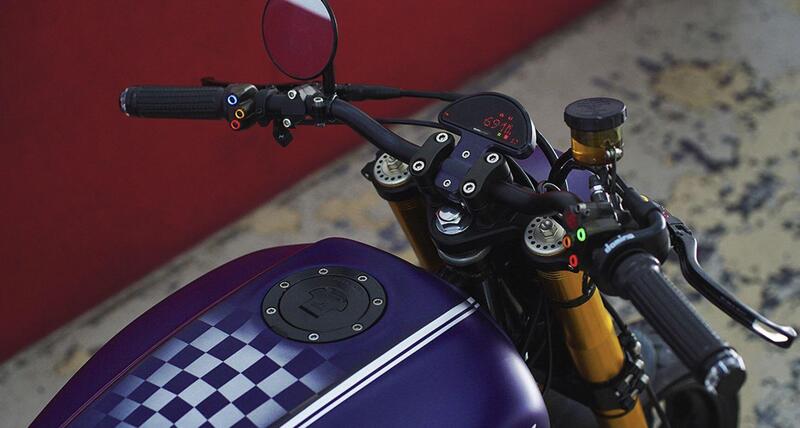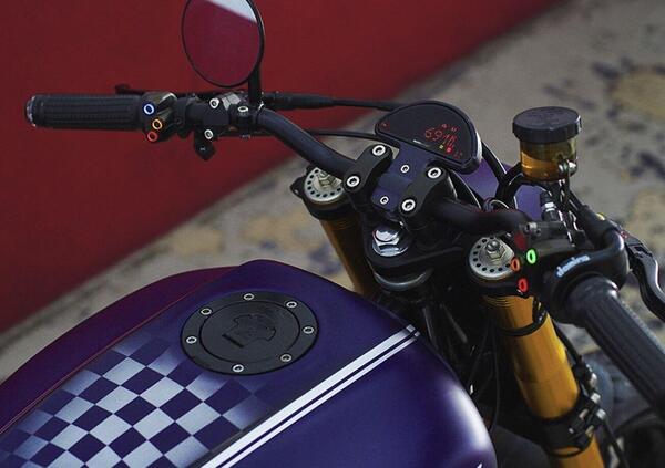Se il serbatoio è restato quello di serie, molto caratterizzante di suo, l'impianto elettrico è stato ricostruito e ci sono comandi, interruttor, fanale e strumento dal catalogo Motogadget.