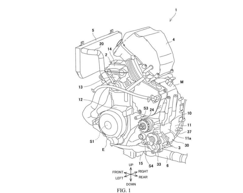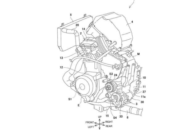 I disegni mostrano come il motore elettrico (indicato con la lettera M) sia posto sopra il gruppo trasmissione, in modo da ottimizzare la struttura motoristica e condividendo i medesimi cambio e frizione. Sul prototipo di Suzuka si è visto come sul carter frizione ci sia un attuatore al posto del solito cavo azionato dalla leva al manubrio.