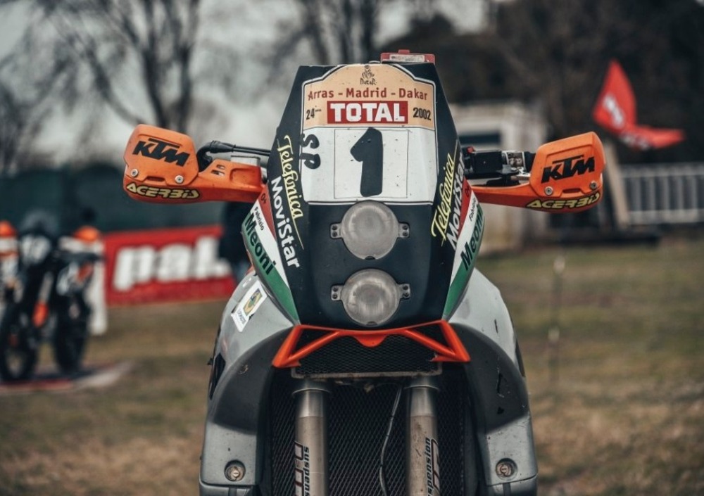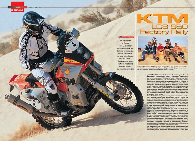 Aprile 2002. Riceviamo un invito da Mattighofen. Allora era per Motocross. Si tratta di andare in Tunisia a provare la 950 LC8. Quella “vera”, la Moto da Corsa che ha vinto la Dakar 2002 con Fabrizio Meoni e da poco il Rally di Tunisia con Joan “Nani” Roma. Brividi. Non avremmo mai detto di no, ma quello che ci aspetta ci mette un po’ di timore. “Provare” la 950 LC8 ufficiale. Provare si fa per dire, e mai con tanta pertinenza come in questo caso. Più volte avrei detto, successivamente, che quella Moto la potevano guidare in pochissimi, e in particolare il solo Fabrizio Meoni con reale, assoluta padronanza. Diciamo imprinting. Non soltanto perché quella Moto l’aveva sviluppata, messa a punto e portata in gara, e alla vittoria, lui. Un esempio. Nani Roma, un colosso di corporatura e di bravura, aveva appena vinto in Tunisia, ma sarebbe tornato al volo alla monocilindrica per vincere anche lui con una KTM la Dakar del 2004. Subito dopo la vittoria di Meoni alla Dakar, tutti volevano la LC8, Nani e Gio’ Sala sono stati i soli che sono riusciti a portarla “degnamente” in Gara, il Gio’ a “conviverci”. Nani ne aveva “paura”, e prima di tornare alla monocilindrica “tirò scemi” i tecnici con mille richieste di modifiche, in particolare al telaio e alle geometrie di sterzo, per riuscire a guidarla.