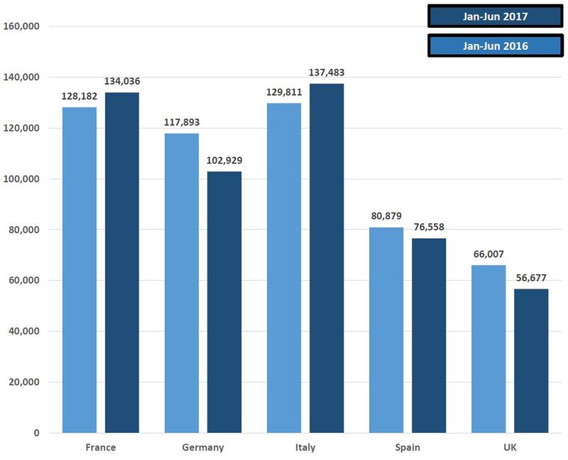 Italia e Francia hanno contribuito a contenere le perdite europee, con il nostro mercato che si conferma il più importante numericamente anche nel primo semestre del 2017 dopo esserlo stato negli ultimi tre anni. Le immatricolazioni italiane sono state 124.913, ovvero il 6,6% in più sullo stesso periodo del 2016. Anche se va ricordato che l'anno scorso il saldo positivo era stato del 13,5%. Sempre quest'anno la Francia ha guadagnato il 2,6% salendo a 91.494 unità, con una crescita comunque meno sostenuta rispetto al +6,5% del 2016. Insomma la flessione tendenziale c'è stata quasi ovunque.