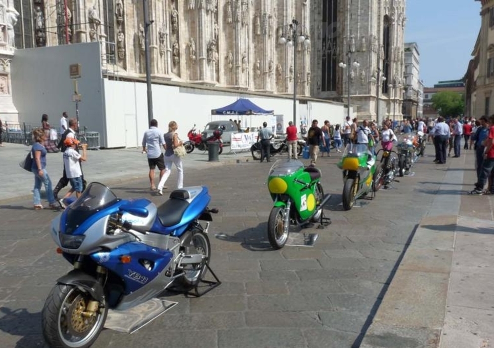 Domenica 11 settembre, davanti al Palazzo Reale di Milano, è stata allestita la mostra statica a fini esclusivamente culturali intitolata “La Motocicletta nel novecento” (sottotitolo: “un secolo di storia Motociclistica italiana ed Estera in esposizione”) che dalle ore 9 alle 16 ha visto allineate nel piazzale incastonato tra il Duomo e l’Arengario – sede del nuovo Museo del 900 - un centinaio di motociclette rappresentative del secolo scorso, parecchie delle quali di gran valore in assoluto. Un’esposizione molto interessante, organizzata dal C.M.A.E. (Club Milanese Automotoveicoli d’Epoca, presieduto dall’architetto Marco Galassi)) con il patrocinio dell’A.S.I. e del Comune di Milano, nell’ambito delle celebrazioni nazionali per il 150° dell’Unità d’Italia.