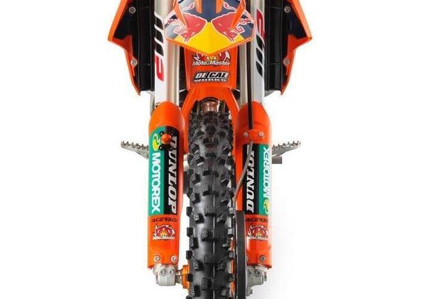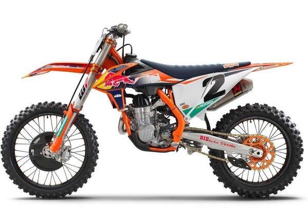 La moto ha telaio in arancione e monta ruote Factory, piastre forcella Factory anodizzate in arancione, paramotore realizzato in composito, coperchio della frizione Hinson e corona arancione.