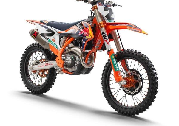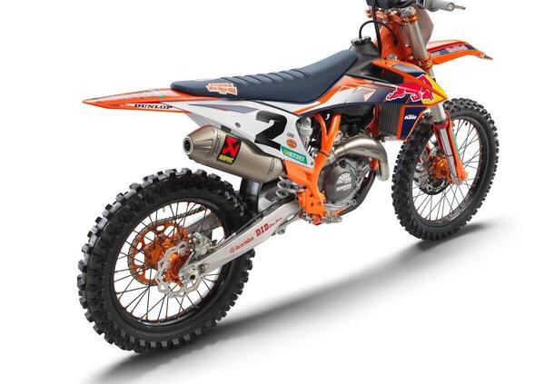 La lista delle specifiche tecniche vanta altri componenti, come il silenziatore Akrapovič, il dispositivo di precarico della forcella holeshot Factory e il disco freno anteriore semi-flottante dotato di protezione.