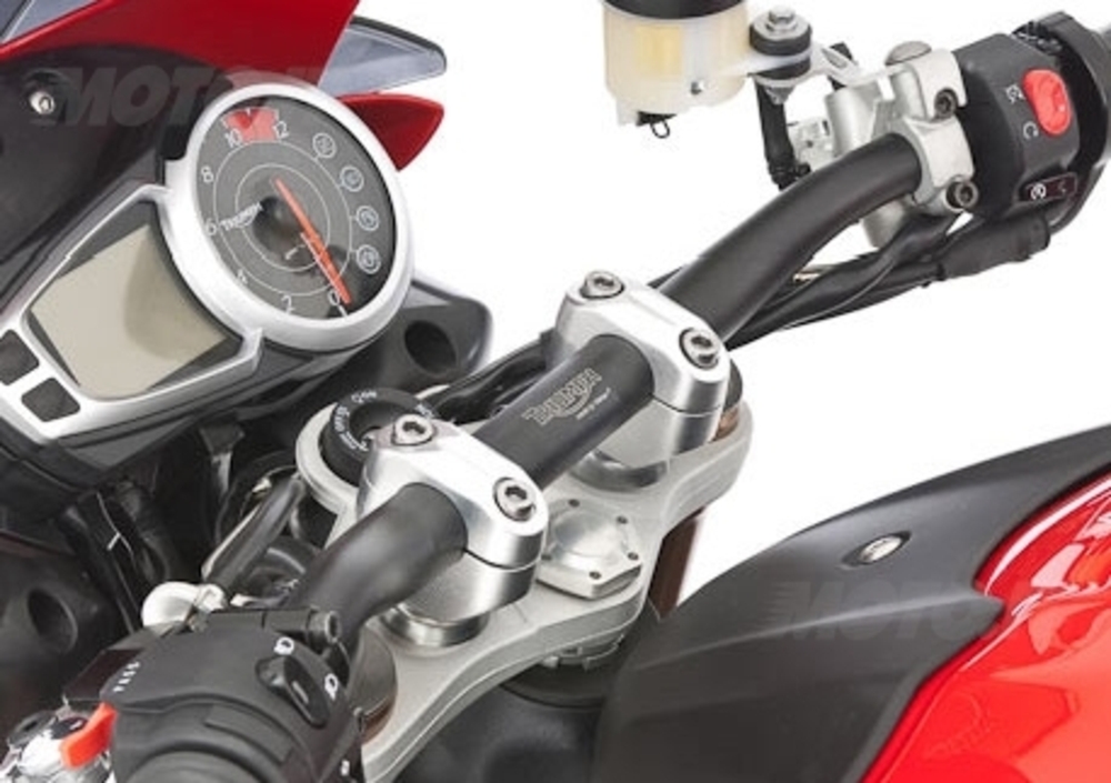 Date un'occhiata anche alle piastre superiori della forcella, sottoposte a una massiccia cura dimagrante. Il risultato? Una Speed Triple ancora più potente (oltre i 130 cavalli del modello attuale) e leggera.