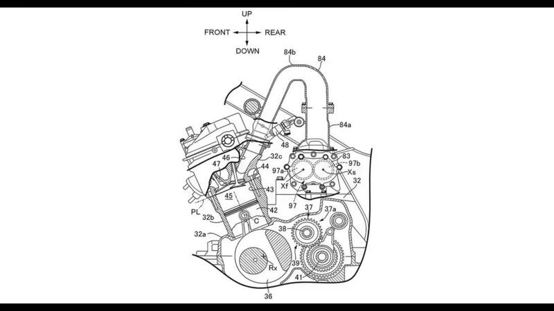 Come sottolineano i colleghi di Motorrad, nel brevetto si parla di un compressore a doppia vite che genera pressione mediante due alberi a vite controrotanti. Il compressore si trova dietro la bancata ed è azionato meccanicamente. L'aria aspirata fluisce attraverso un sistema di tubazioni dalla zona del cannotto di sterzo fino al compressore. Una valvola bypass nel tubo di pressione sale verticalmente verso l'area di aspirazione per scaricare la pressione in eccesso. Infine due collettori di aspirazione scendono ai due cilindri. Qui troviamo anche gli ugelli di iniezione in alternativa o aggiunta a quella diretta sulla testata. Honda mantiene possibili entrambe le opzioni.