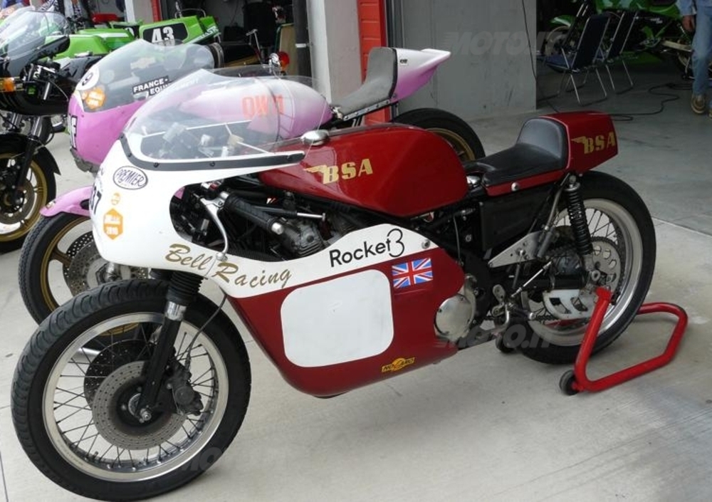 Triumph – BSA 750 – Vincitrici a Daytona nel 1971, l’anno dopo queste tricilindriche inglesi erano ancora protagoniste, ma in seguito sono state relegate al rango di comprimarie e quindi sono scomparse rapidamente dalla scena. Avevano un motore a tre cilindri raffreddato ad aria, con distribuzione ad aste e bilancieri e lubrificazione a carter secco, che erogava una potenza prossima agli 85 CV a un regime dell’ordine di 8200 giri/min. L’alesaggio era di 67 mm e la corsa di 70 mm. Il telaio a doppia culla continua realizzato dallo specialista Rob North (che a un certo punto ha sostituito quello dei modelli stradali di serie) aveva un disegno che ha ispirato molti altri progettisti.
