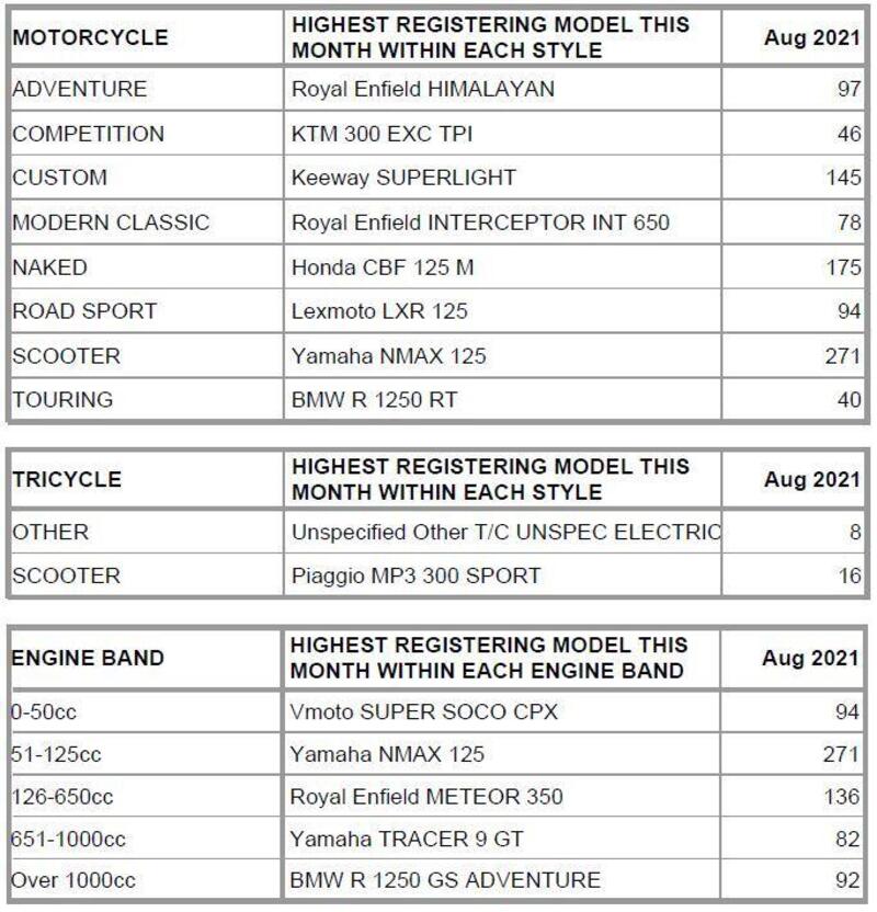 Nella classifica delle vendite di agosto (queste statistiche riportano solamente il modello più venduto per ciascuna categoria e classe di cilindrata) le moto oltre i 125 cc in evidenza sono le Royal Enfield Meteor e Himalayan, la BMW R1250GS Adventure e la Yamaha Tracer 9 GT.