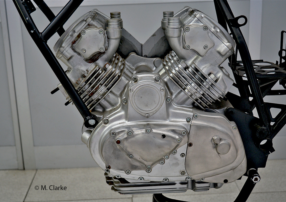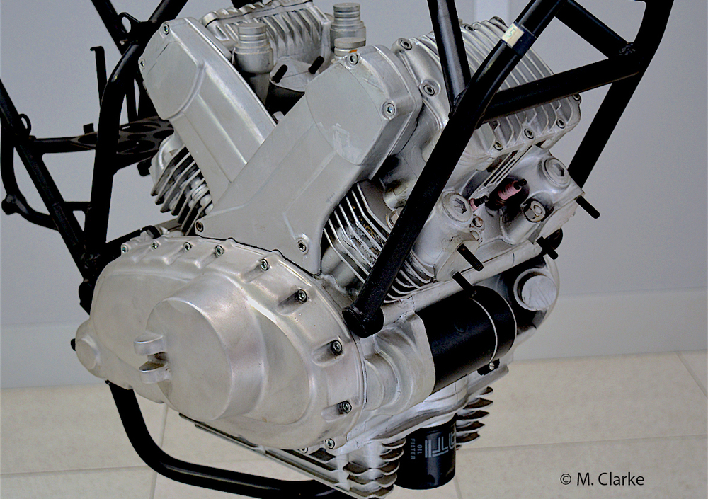 Questo quadricilindrico a V di 90° è stato disegnato nel 1981, anche se l’idea Taglioni l’aveva avuta un paio di anni prima. Tra le particolarità tecniche di maggiore interesse spiccava il raffreddamento misto aria-olio. Le cinghie dentate che comandavano i due alberi a camme (uno per ogni bancata di cilindri) erano poste sul lato sinistro, al contrario di quanto avveniva nel bicilindrico. L’albero a gomiti monolitico lavorava interamente su bronzine.
