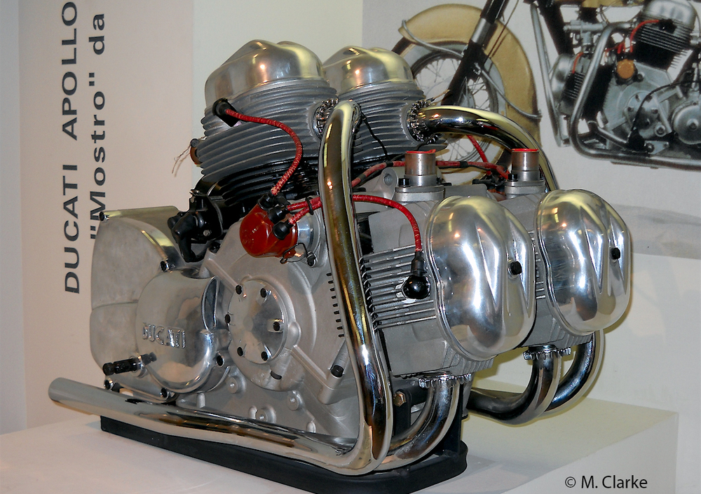 Se escludiamo quelli della MotoGP e della Desmosedici Race Replica, ce ne sono stati altri tre, rimasti tutti allo stadio di prototipo. E un altro era stato pensato dall’ing. Fabio Taglioni prima ancora di arrivare a Borgo Panigale. Si trattava di un 250 da competizione con architettura a L, scelta perché offriva una ottima equilibratura e al tempo stesso consentiva un agevole raffreddamento dei cilindri posteriori, che potevano essere investiti abbastanza liberamente dall’aria.
