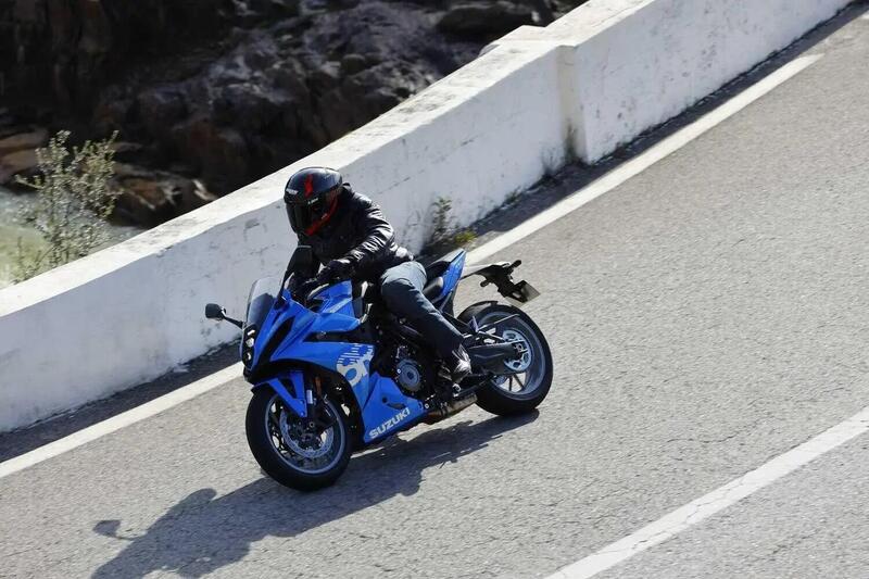 Sella a 810 mm da terra: facilissimo poggiare i piedi con sicurezza nelle soste grazie anche alla snellezza della zona di raccordo tra sella e serbatoio. La sospensione anteriore e quella posteriore vedono all'opera unità Hitachi Astemo (Showa) specifiche per la GSX-8R: una forcella SFF-BP (Separate Function Fork - Big Piston) e un monoammortizzatore progressivo con regolazione del precarico, per dare piacere di guida, maneggevolezza e stabilità a qualsiasi andatura. I cerchi in lega da 17 pollici montano pneumatici Dunlop RoadSport 2 nelle misure 120/70 e 180/55. Anche l'impianto frenante ha un'anima “R”: all'avantreno troviamo due dischi da 310 mm con pinze Nissin a quattro pistoncini ad attacco radiale, mentre al posteriore c'è un disco da 240 mm con pinza a pistoncino singolo.