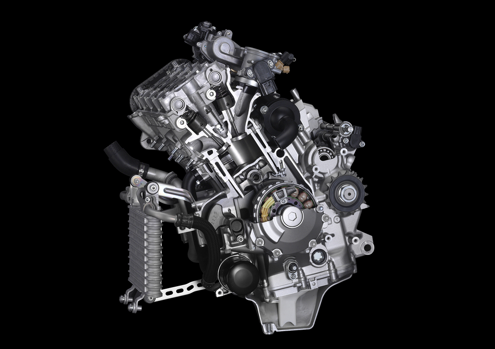 Nel motore della casa di Iwata spiccano le bielle in lega di titanio, tipicamente riservate alle realizzazioni da competizione, e l’albero “crossplane”, con manovelle disposte su due piani a 90°. Le fasi utili (che nei quadricilindrici in linea tradizionali si susseguono ogni 180°) sono distanziate quindi di 270°… 180°…90°…180°. Entrambi i motori hanno la bancata dei cilindri disassata e un albero a gomiti con inerzia sensibilmente ridotta rispetto al modello precedente.