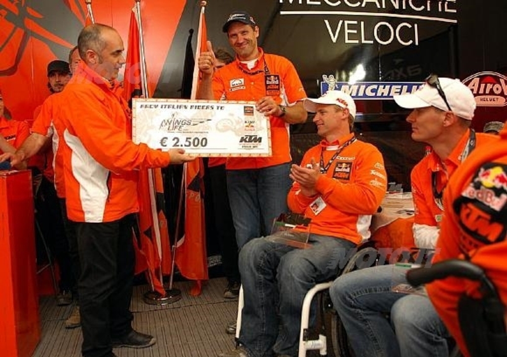 Evento clou della giornata di domenica è stata la cerimonia, svoltasi presso la hospitality KTM Italia, dove Angelo Crippa, a nome e per conto dei piloti del Trofeo Motocross e della stessa filiale italiana, ha consegnato ad Heinz Kinigadner un assegno di 2.500 euro per la fondazione Wings for Life (impegnata nel supporto della ricerca delle lesioni della colonna vertebrale), della quale Kini è co-fondatore e rappresentante.