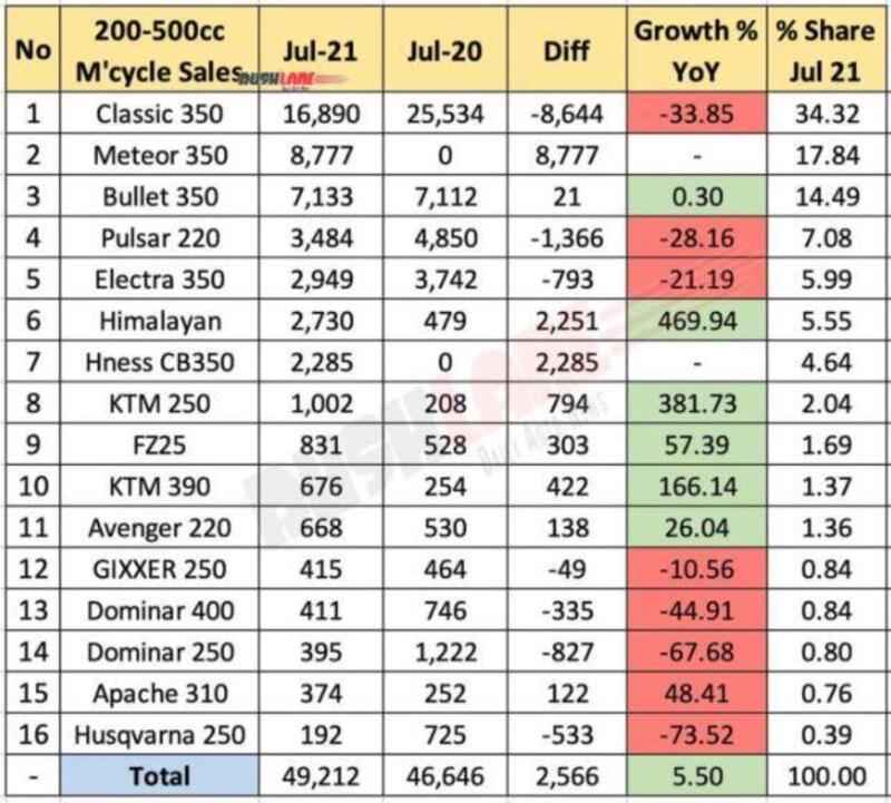 La classifica è dominata da Royal Enfield che occupa le prime tre posizioni con i modelli Classic 350 (quasi 17.000 esemplari, il 34% rispetto a un anno prima quando però la moto era stata appena lanciata), la nuova Meteor 350 e la Bullet 350, che replica le oltre 7.000 unità dell'anno scorso.