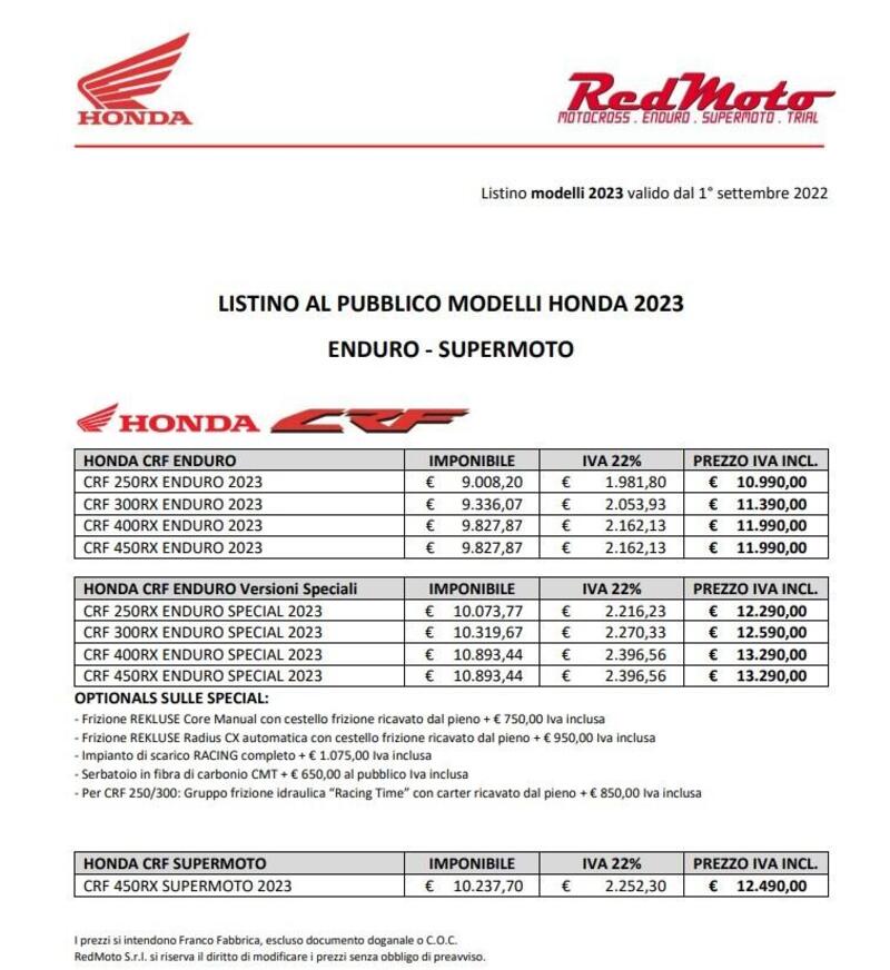 "L’omologazione per la circolazione stradale - hanno concluso da Honda - e il relativo allestimento sono come sempre a cura di RedMoto S.r.l., partner di Honda Motor Europe Ltd Italia per la distribuzione della gamma fuoristrada Honda CRF in Italia. Tutti i modelli Honda CRF Enduro 2022 sono omologati Euro 5, 1 posto e godono della cosiddetta “doppia omologazione” enduro-supermoto".