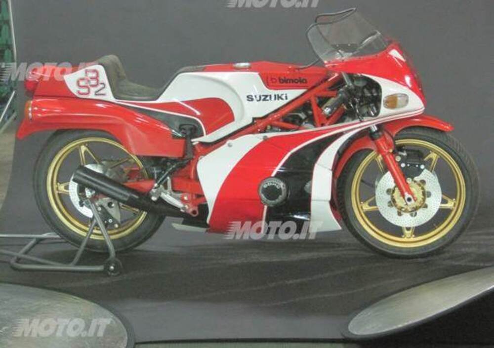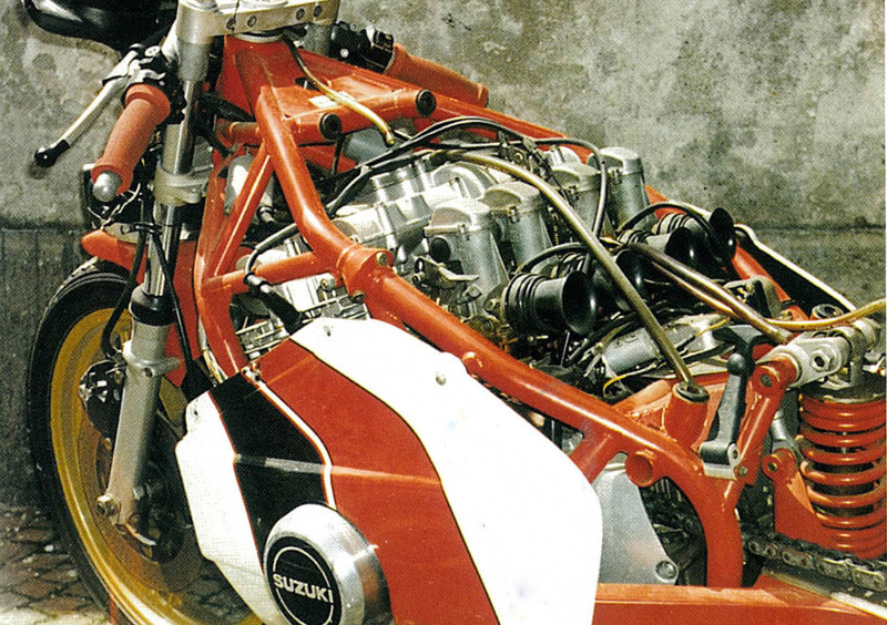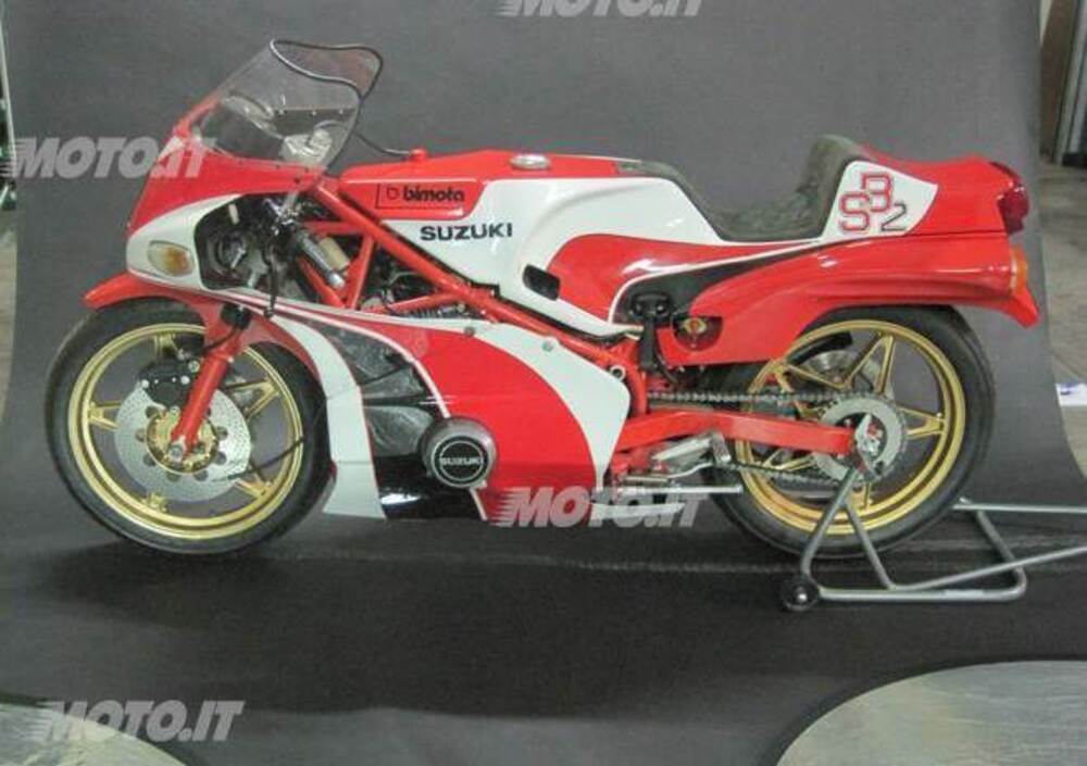 In realtà, il prototipo dell’ambiziosa SB2, supersportiva stradale spinta dal primo quadricilindrico a 4 tempi mai costruito da Suzuki, apparve al Moto Show bolognese del 1976 con soluzioni tecniche piuttosto ardite: i collettori di scarico infatti passavano sopra al motore, e terminavano in due silenziatori sottosella; mentre il serbatoio era piazzato sotto al motore, ovviamente per abbassare il baricentro acquisendo maneggevolezza. Ma il notevole percepito dal pilota, e la difficoltà di posizionare a dovere la pompa della benzina che alimentava i 4 carburatori Mikuni da 26 mm, portarono il progettista romagnolo a tornare su terreni più facilmente percorribili: serbatoio su, e scarico (4-in-1) giù.