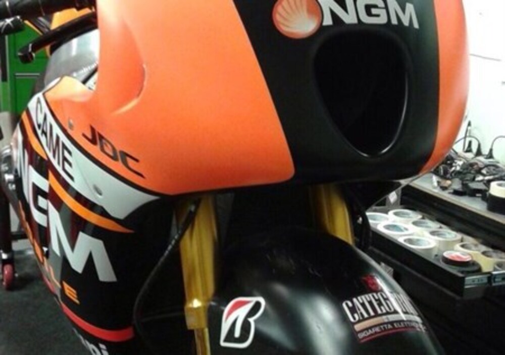 La ciclistica invece si basa su un telaio FTR, con sospensioni Öhlins pressurizzate, freni Brembo (nelle foto vediamo unità in acciaio, coerenti con le gomme da bagnato montate…) e sovrastrutture naturalmente dedicate, per un peso a secco (regolamentare) di 157 kg.