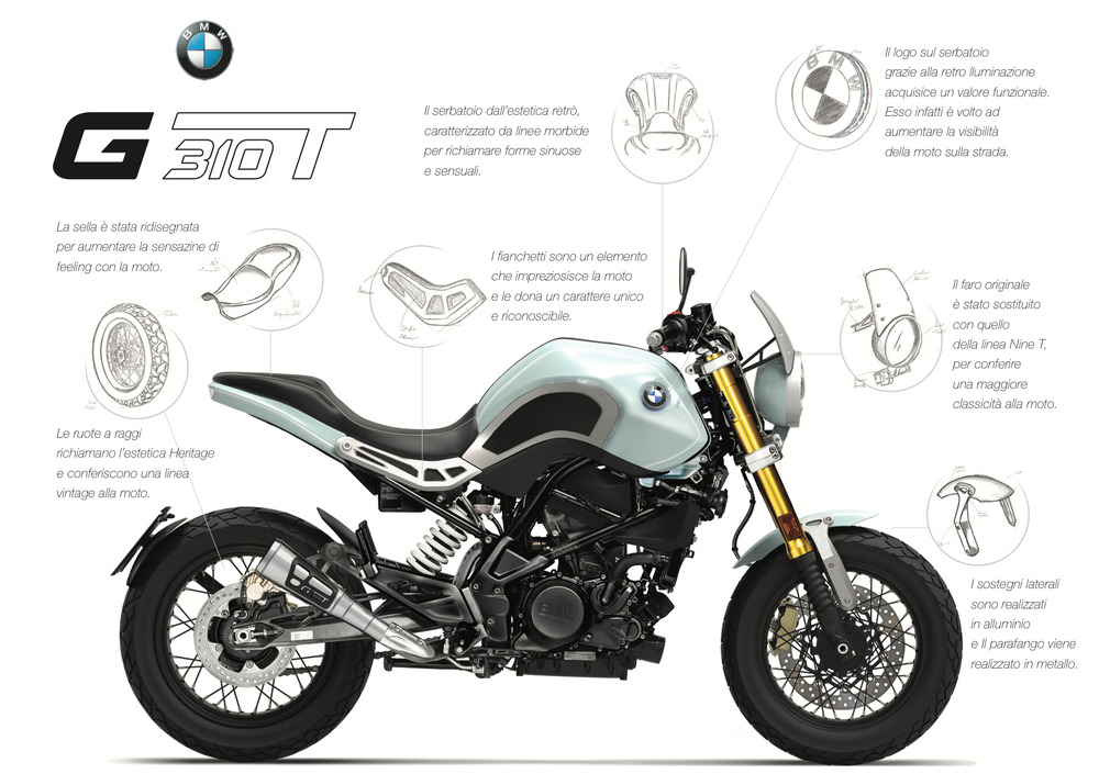A quest'ultimo gruppo è stata dedicata la G 310T, una sorta di modello heritage assente nel listino BMW e che gioca con linee classiche assieme a tratti più sportivi. Sulla G 310T ci sono alcuni dettagli estetico funzionali realizzati in alluminio e un'attenzione particolare all'ergonomia; in quest'ambito, come nelle proposte cromatiche, sono stati utili alcuni input arrivati da una ricerca che ha coinvolto numerose motocicliste. E' così che sono cambiate anche forma e misure di serbatoio e sella, il posizionamento delle leve al manubrio e delle pedane.
