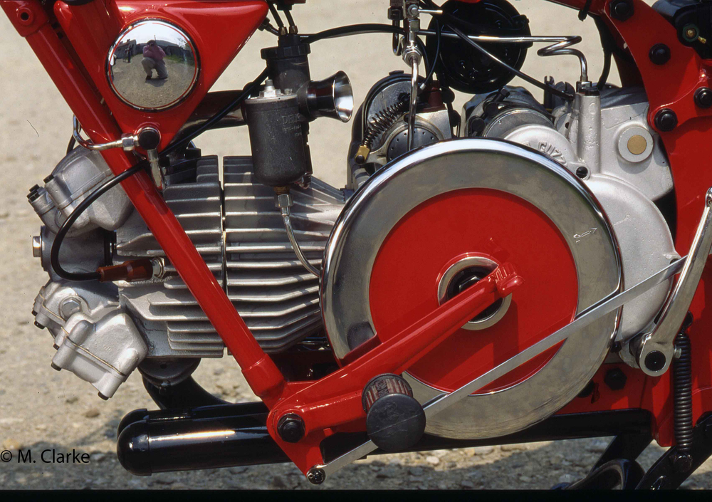 Fin dall’inizio della sua storia, la Guzzi ha costruito moto a cilindro orizzontale (leggermente disassato) con un grosso volano esterno, posto sul lato sinistro, e con la lubrificazione a carter secco. Soluzioni d’avanguardia, per i tempi, erano la trasmissione primaria a ingranaggi e il cambio in blocco. Per i suoi monocilindrici di serie di 500 cm3, nei quali spiccavano anche le misure caratteristiche nettamente superquadre (88 x 82 mm), la casa di Mandello del Lario è rimasta fedele a queste scelte fino alla metà degli anni Cinquanta.