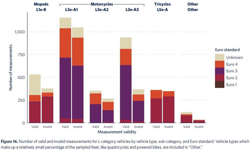 Passando alla categoria dei veicoli L (che comprende ciclomotori, motocicli e tricicli), la ricerca ricorda come rilevazioni nella regione parigina del 2015 abbiano registrato che con il 7% del traffico chilometrico le "due ruote" abbiano prodotto il 46% delle emissioni di HC, gli idrocarburi incombusti.