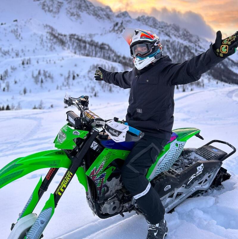 “è più che altro per la mia provenienza dal FMX. Preferisco la snow bike perché è più agile, leggera e perché di fatto è la mia moto da cross, mi consente di divertirmi ed esprimermi. Ma è totalmente diversa da una motoslitta che rimane il mezzo ideale per andare sulla neve. Ti permette la massima libertà in montagna è molto potente, è impareggiabile se devi spostare materiali. Viene usata dagli snowboarder e negli impianti di risalita per il soccorso, arriva sulle piste in un attimo. Puoi raggiungere le vette in modo veloce. E se la usi per divertimento, il senso di libertà di poter andare ovunque è impareggiabile”