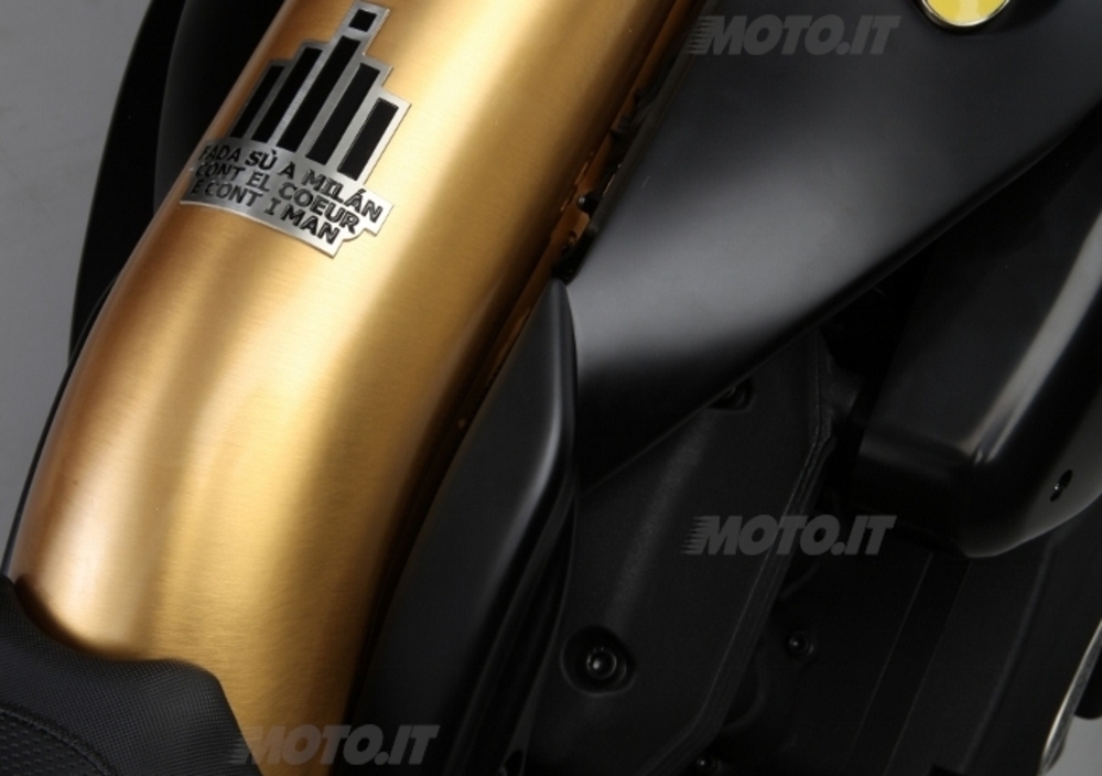 Il telaio con finitura dorata è l’unico elemento cromatico di stacco in questa “Conlatusa” (DUU in versione biposto) completamente nera opaca, che nei colori si rifà alla tradizione delle auto da corsa anni ’70.