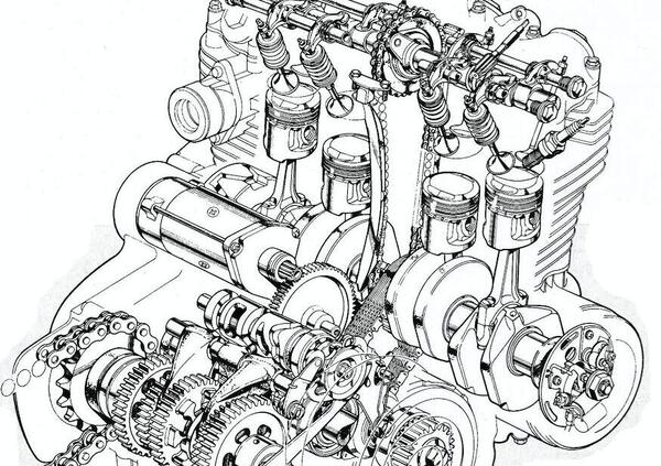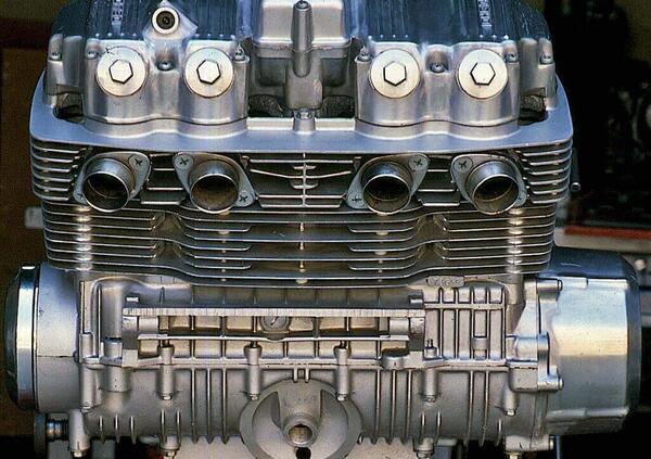 Nel motore, dotato di un alesaggio di 61 mm e una corsa di 63 mm, spiccavano l’albero a gomiti in un sol pezzo che lavorava su bronzine, la lubrificazione a carter secco e la trasmissione primaria affidata a due catene a rulli affiancate. Pure le altre quadricilindriche Honda della prima generazione, ovvero le famose Four (CB 500, CB 350 CB 400, più le successive 550 e 650), nelle quali la trasmissione primaria era mista e la lubrificazione a carter umido, avevano la distribuzione monoalbero.
