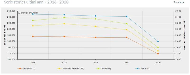 Le limitazioni alla mobilità imposte dalla pandemia hanno ridotto di molto il traffico e di conseguenza il numero di incidenti. Nelle autostrade -39,9% di incidenti e -37,1% morti; sulle strade extraurbane -27,5% incidenti e -25,7% vittime; numeri che nei centri abitati sono scesi rispettivamente del 31,7% e 20,3%.