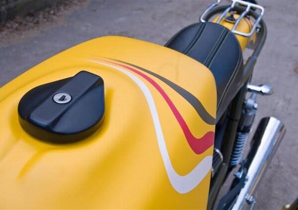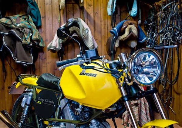 Il portapacchi in stile anni ’60, la palpebra proteggi-faro della Moto Aermacchi-Cagiva 125 SST del 1975 ed il parafango anteriore originale della Ducati Scrambler del 1973 sono un forte richiamo alla storia del motociclismo italiano di quegli anni.