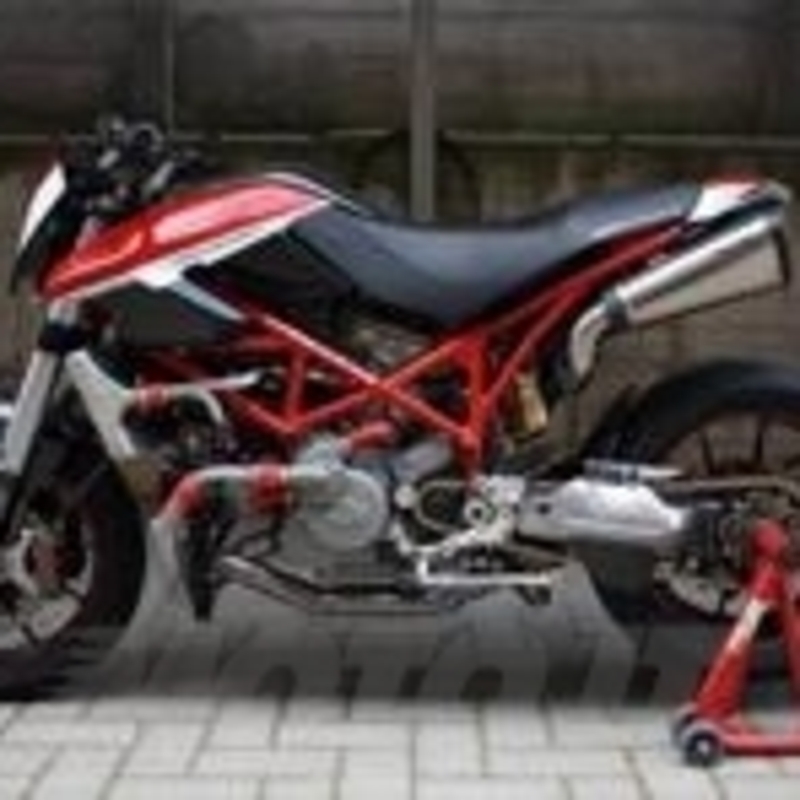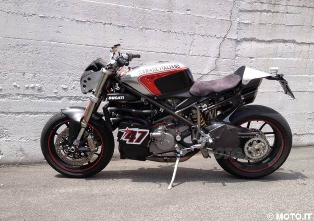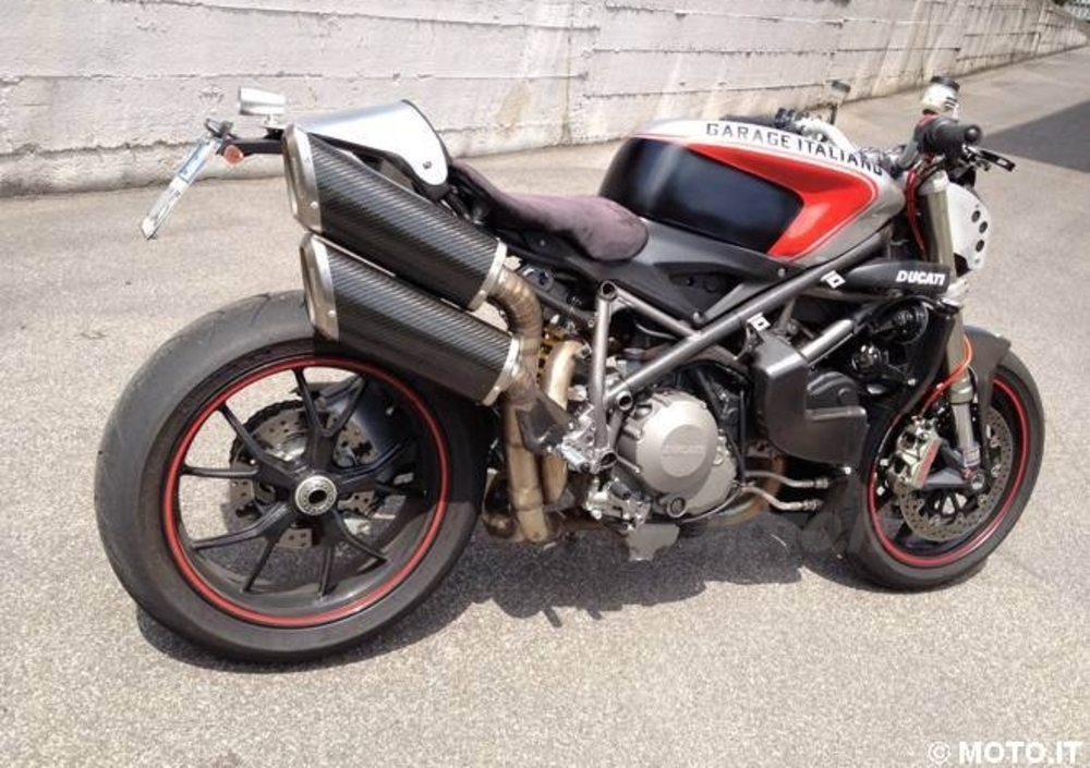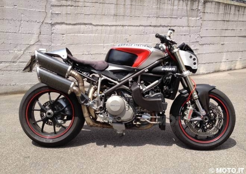 Le sovrastrutture sono composte da un copriserbatoio in vetroresina, realizzato per mantenere inalterato il serbatoio di serie e mantenere la reversibilità della trasformazione, fianchetti modificati ed ospitati da un telaietto reggisella di derivazione 999 (così come la sella). Il codino è realizzato a mano in alluminio, ed ospita un faretto posteriore a LED realizzato al tornio nonché il portatarga in acciaio per evitare problemi di affaticamento del materiale. Naturalmente visibili le "spruzzate" di fibra di carbonio generosamente sparse per tutta la moto.