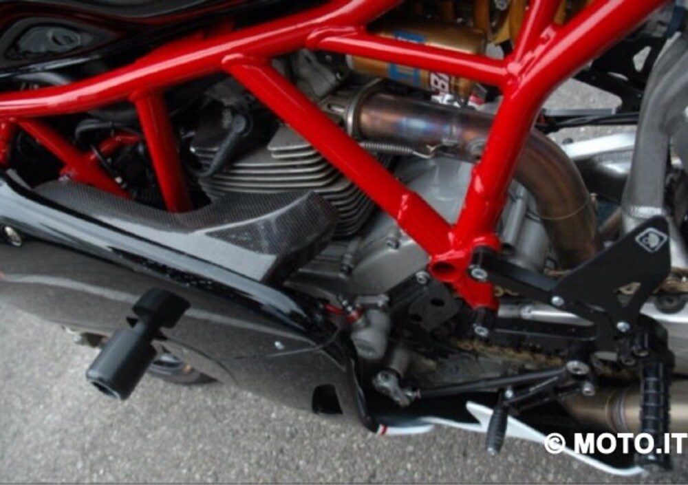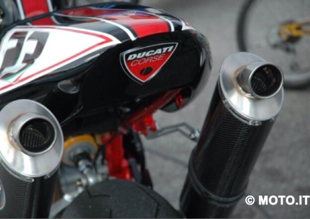 Per quanto riguarda la sostanza, le sospensioni sono state riviste nell’idraulica, mentre sono state sostituite con altre più leggere piastre di sterzo, semimanubri, leve, pedane. Lo scarico è un impianto completo Silmotor racing con silenziatori in fibra di carbonio e mappatura dedicata. Diversi i particolari in fibra di carbonio: i due parafanghi, i convogliatori aria, copripignone, carenatura, pinna protezione catena e carter copricinghie. Il motore è appena stato tagliandato e vi sono state sostituite cinghie distribuzione, olio e filtro.