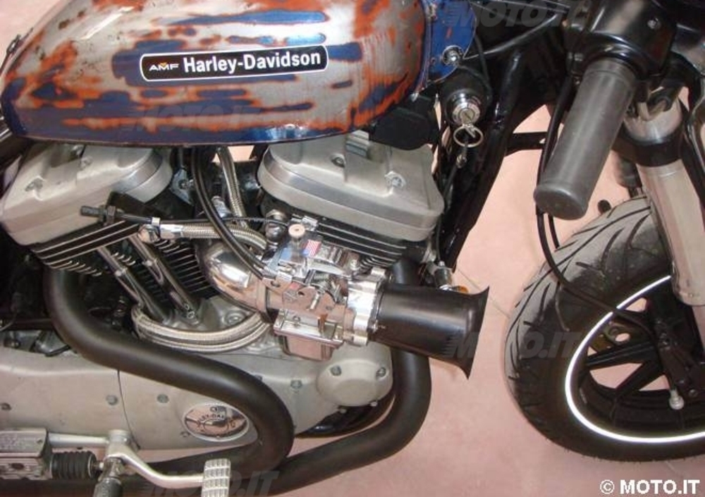 Restando sul lato destro spiccano il carburatore Edelbrock e lo scarico Supertrapp due-in-uno, così come il codino monoposto che vede l'apposizione di fianchetti diversi rispetto al modello di serie. I due semimanubri determinano una posizione di guida nettamente diversa dall'originale - vista la nuova impostazione forse sarebbe valsa la pena di adottare pedane arretrate più in linea con le ambizioni sportive della moto.