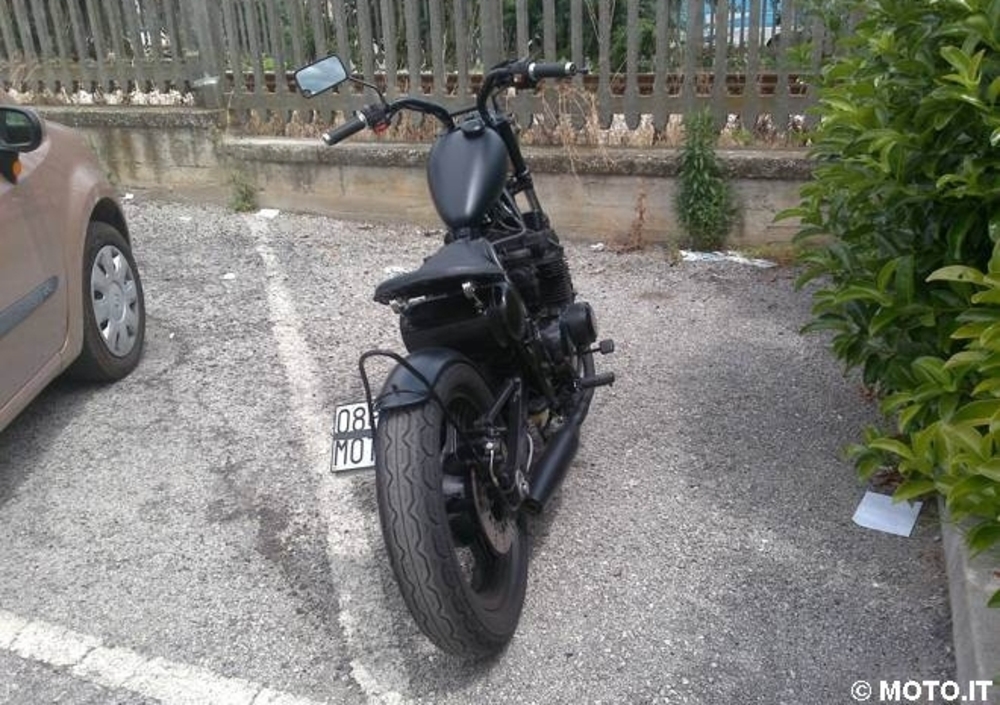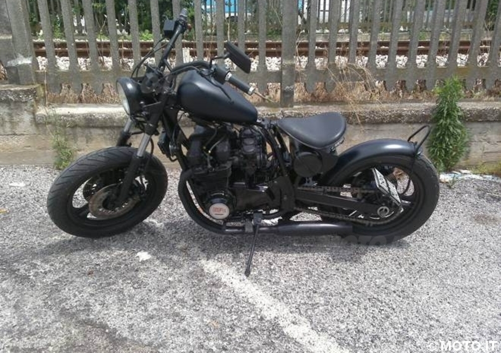 La moto non è male, e appare ben curata nei particolari che ne hanno stravolto i connotati da antica sportiva semicarenata dalle notevoli prestazioni, per quei tempi (poco meno di 220 orari effettivi, se ricordiamo bene, quindi parecchio sopra le righe ancora oggi…): vedi serbatoio a goccia, sella monoposto debitamente distanziata per lasciar scoperta la giusta dose di telaio, e con sotto il “barilotto” che ovviamente non crediamo sia un serbatoio separato dell’olio motore, ma comunque fa il suo bell’effetto, al pari del manubrio ad hoc. Idem per il parafango posteriore a filo di pneumatico, sorretto da un piacevole supporto in sottile tondino d’acciaio, mentre la ruota anteriore è lasciata libera di lavare allegramente il pilota, quando l’asfalto è bagnato. Decisamente meno in linea con il genere il forcellone in alluminio con tendicatena eccentrici, e la classica sospensione progressiva Uni Trak, che però renderà senz’altro più facile la vita alle terga del pilota.